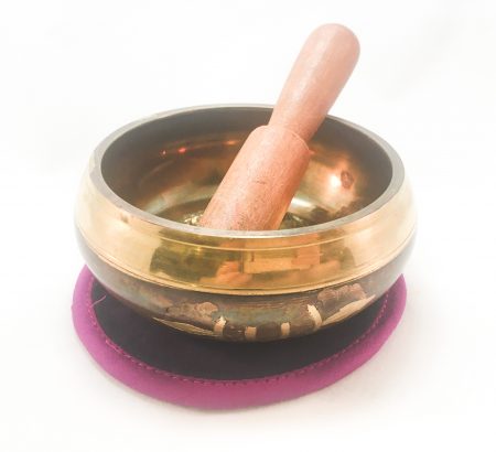 This hand etched singing bowl is decorated with the mantra “om mani padme hum” written in Tibetan. It has the symbol of the double dorge in the center. On the back, it has the eyes of the Buddha, which represent awareness.