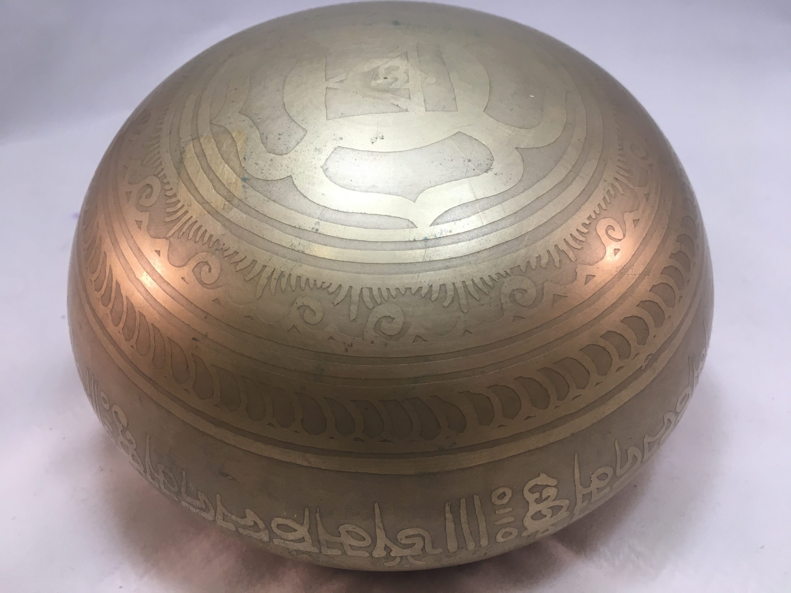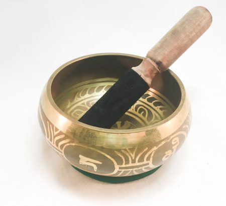This hand etched bronze bowl is made in Nepal. It is decorated with the mantra “om mani padme hum” as well as a beautiful mandala, on both the inside and around the bowl.