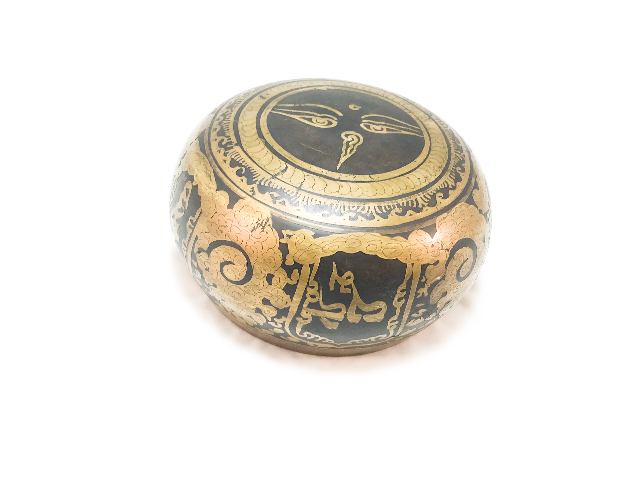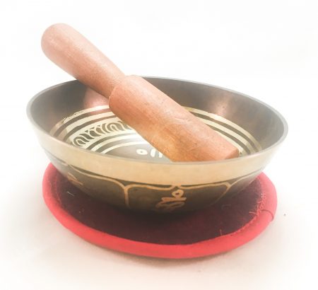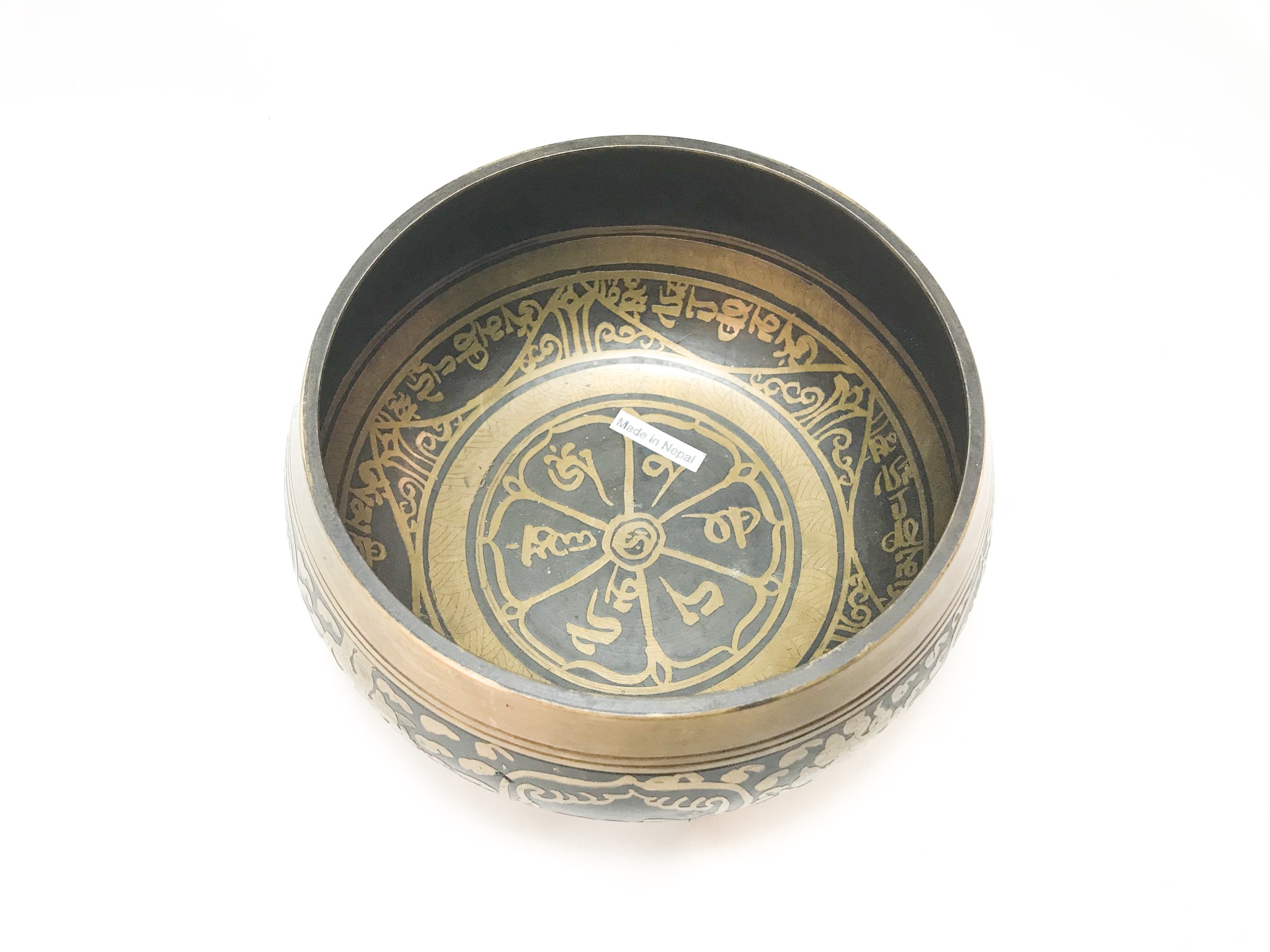 This hand etched singing bowl is decorated with the mantra “om mani padme hum” written in Tibetan. In the center it has a mandala, and on the back the eyes of Buddha.