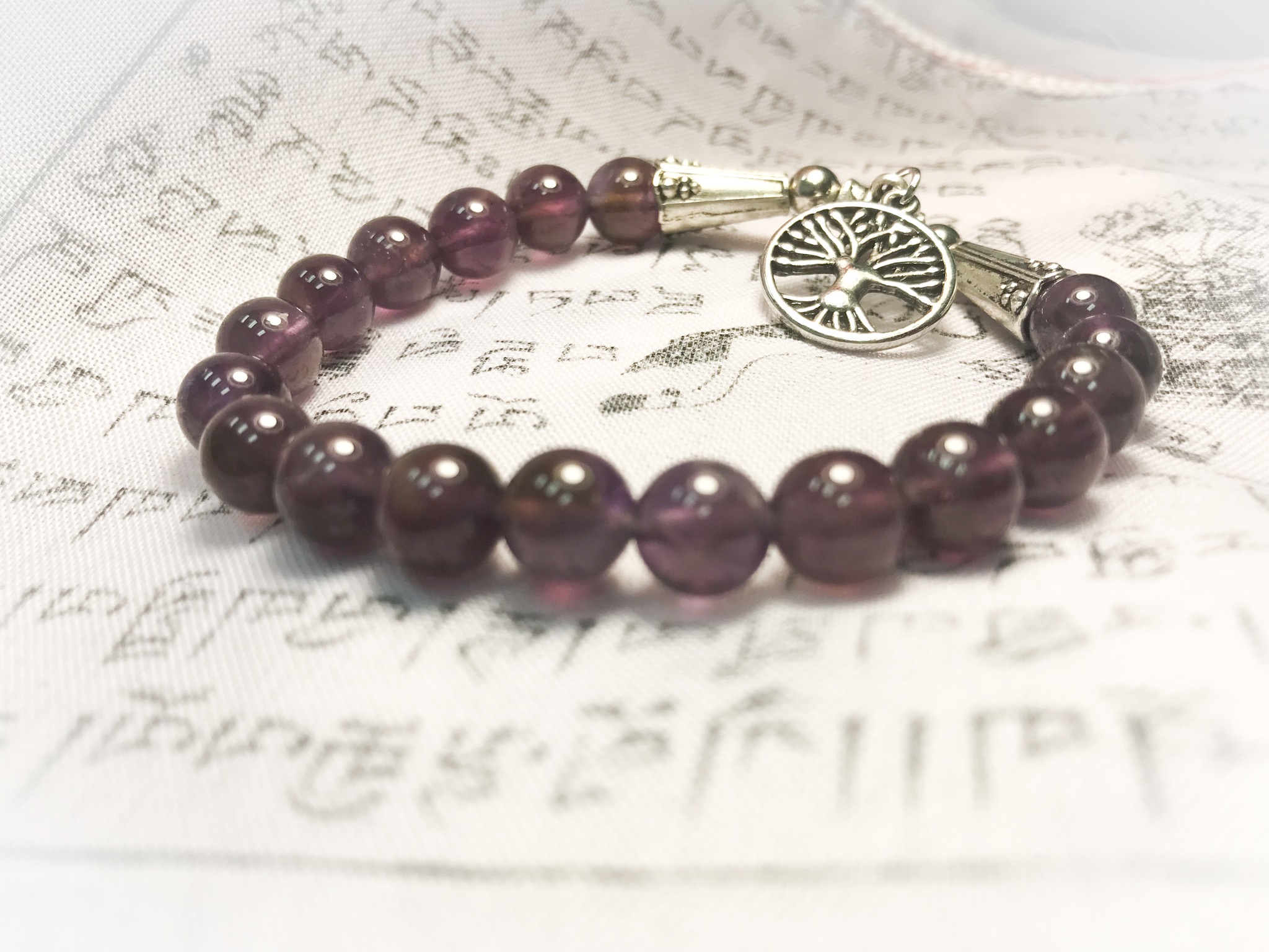This bracelet has an elastic stretchy band and silver charm with a tree of life symbol.