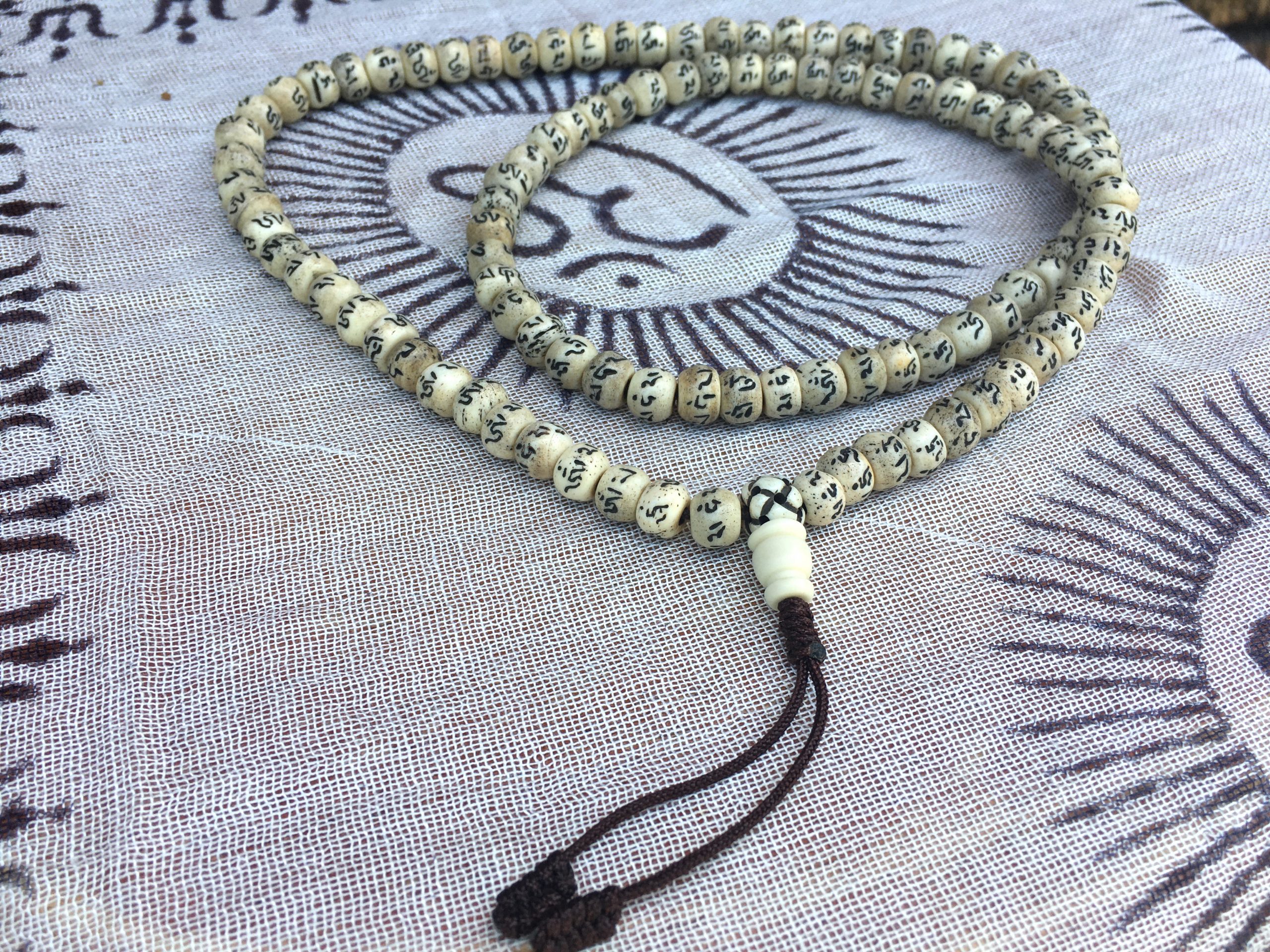 This 108 bead Mala is made from yak bone, hand-etched with the mantra, “om mani paddle hum”. It has an infinity knot guru bead.