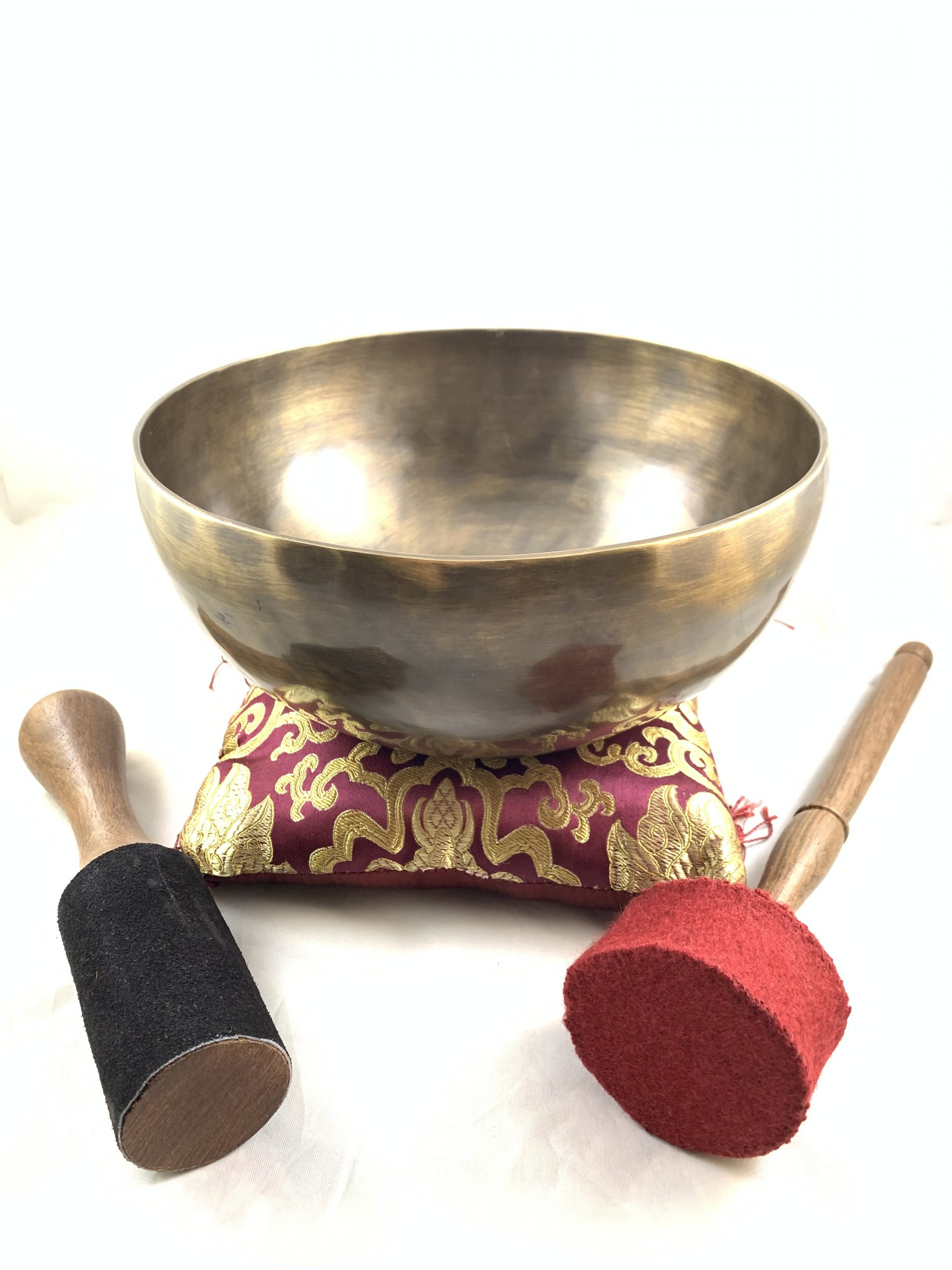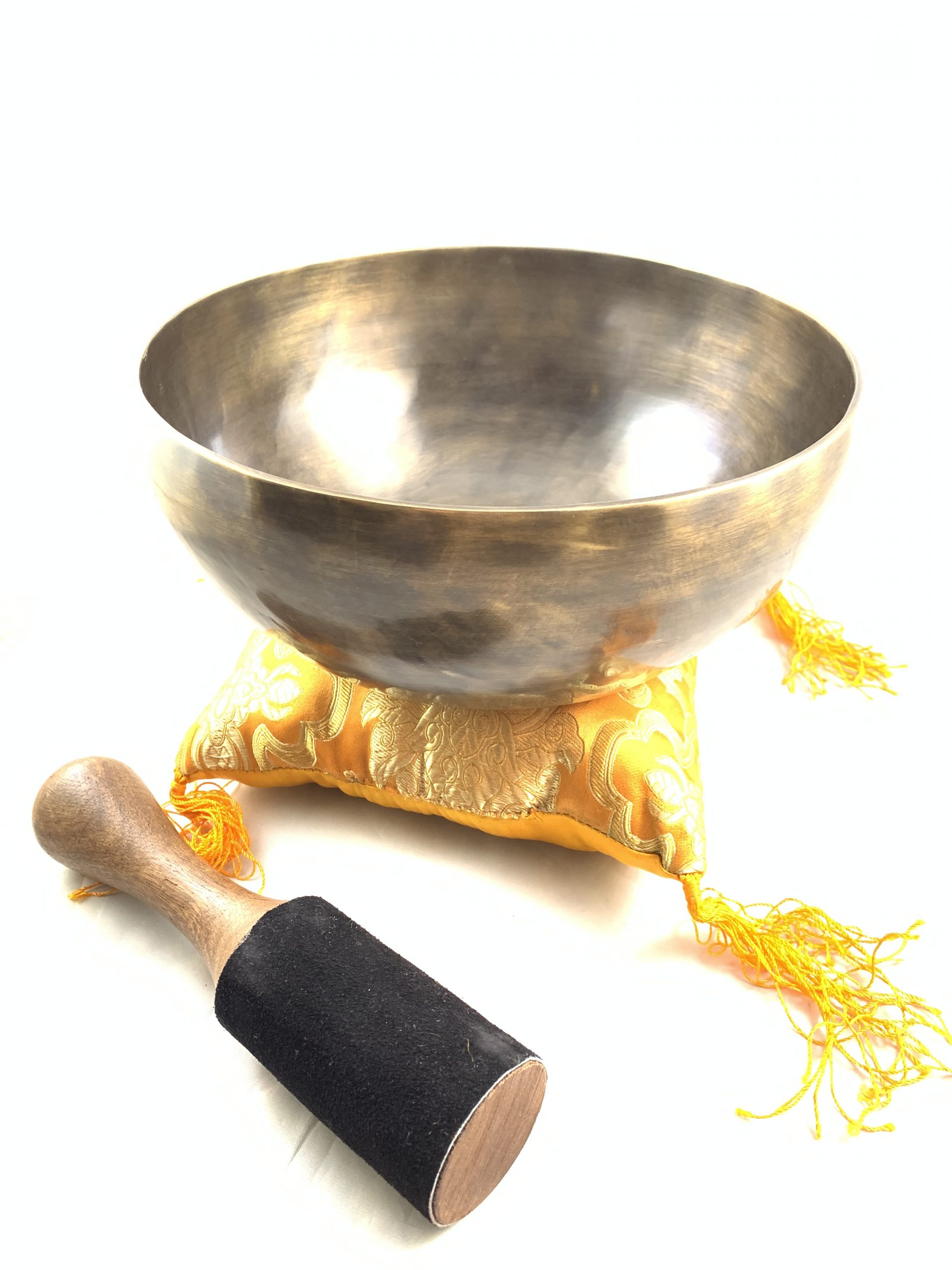 This bowl is a hand-hammered therapy bowl that has a mat polish finish.