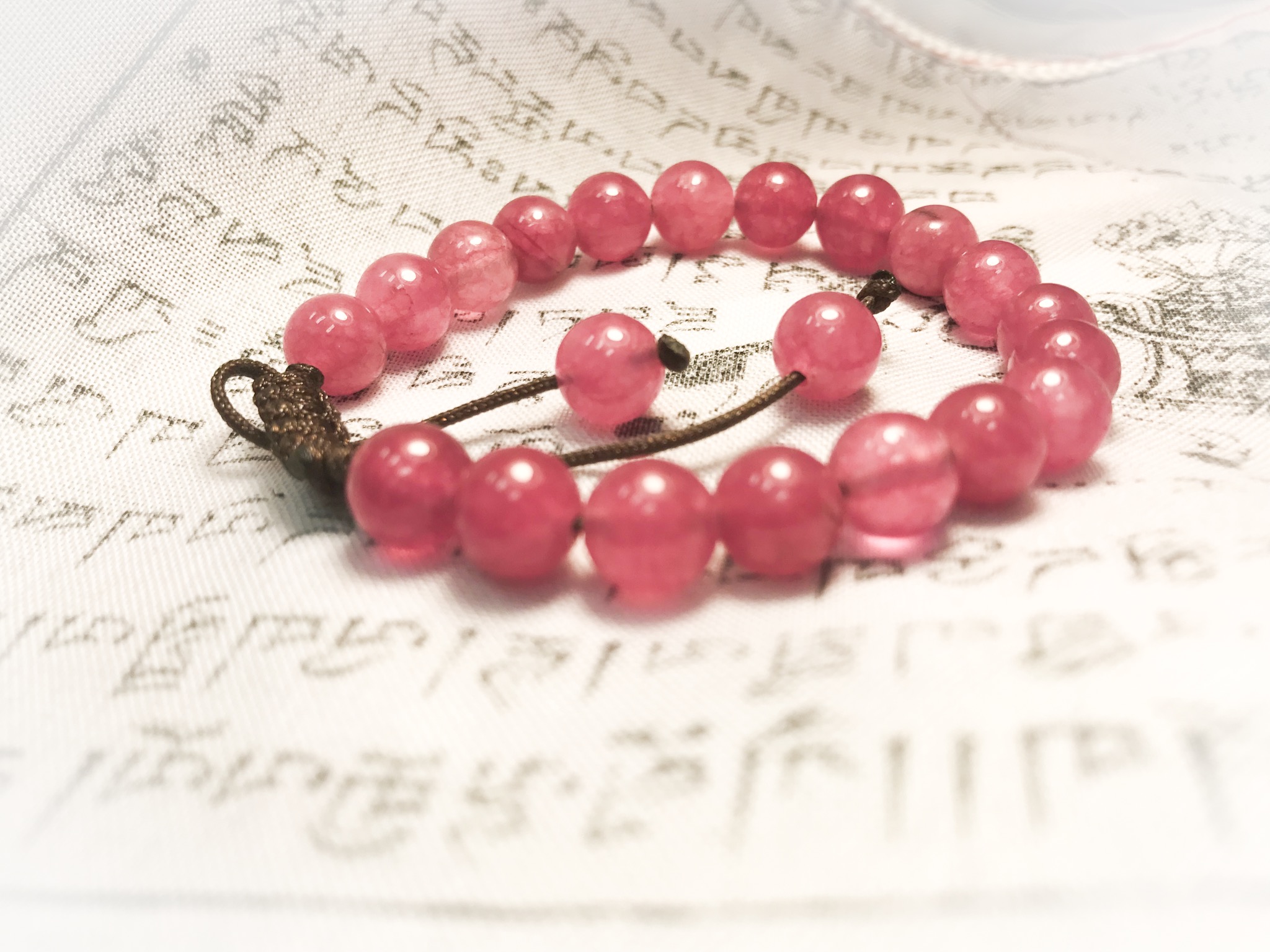This pink agate bracelet is made with an adjustable string band.