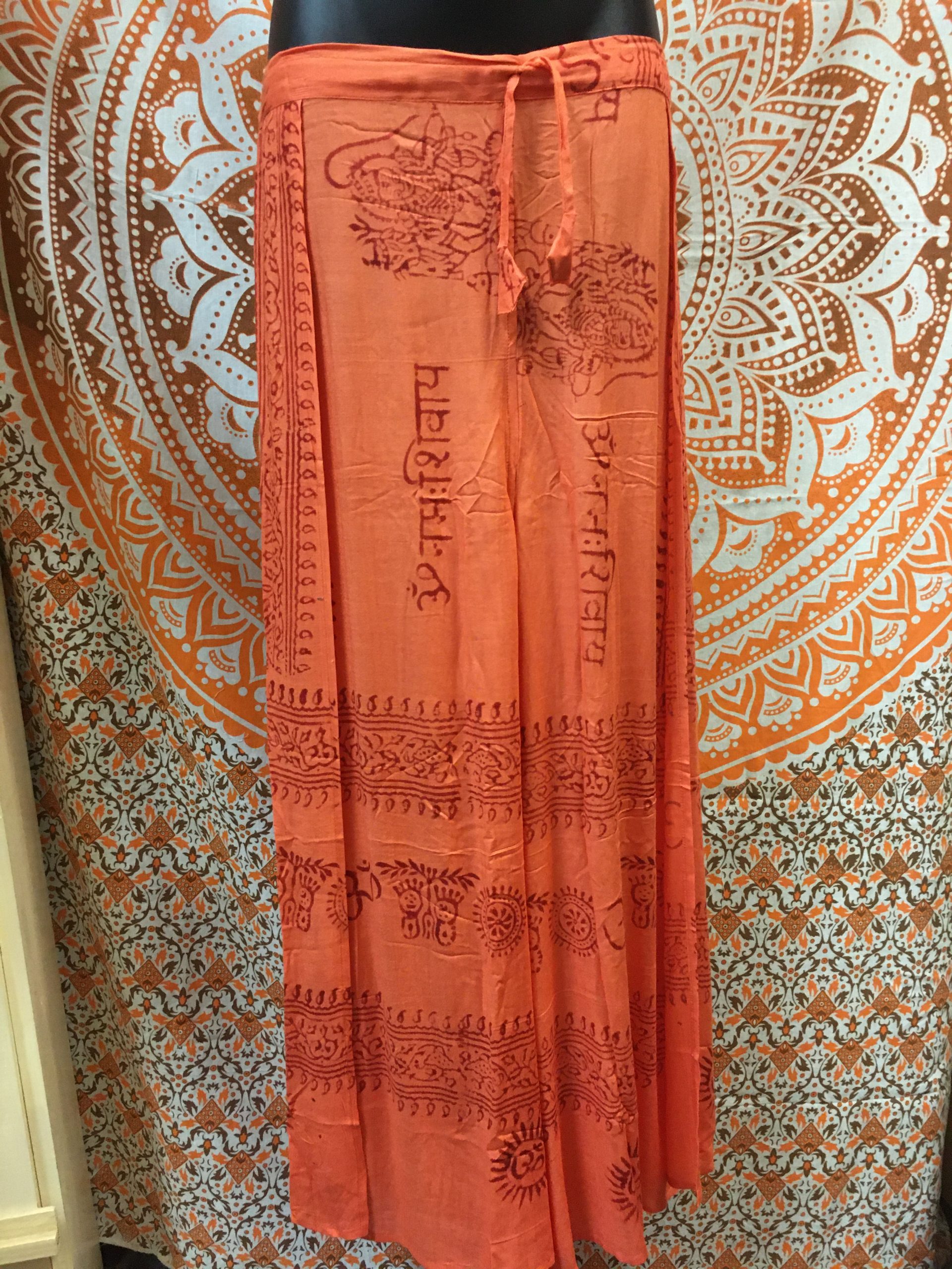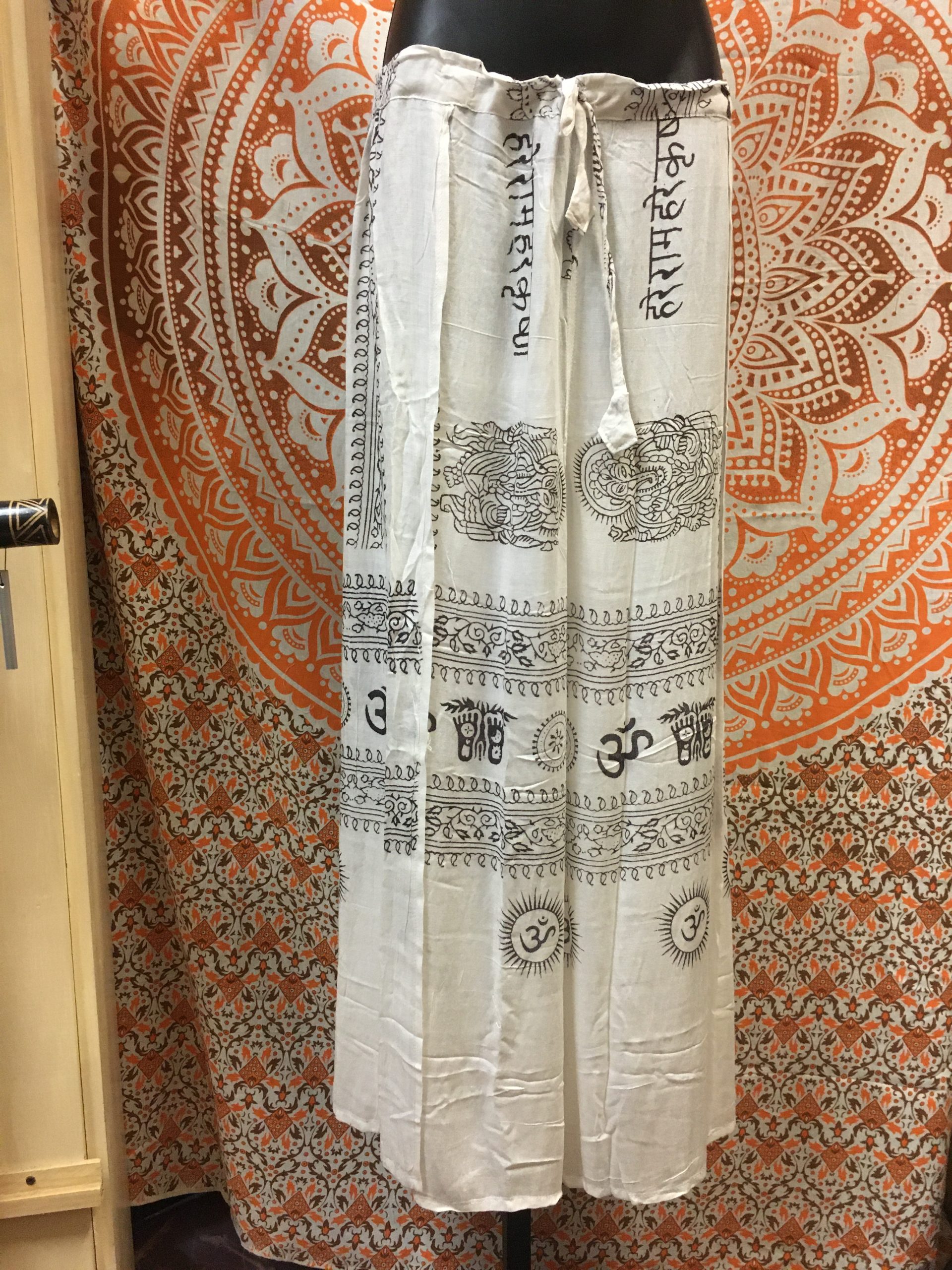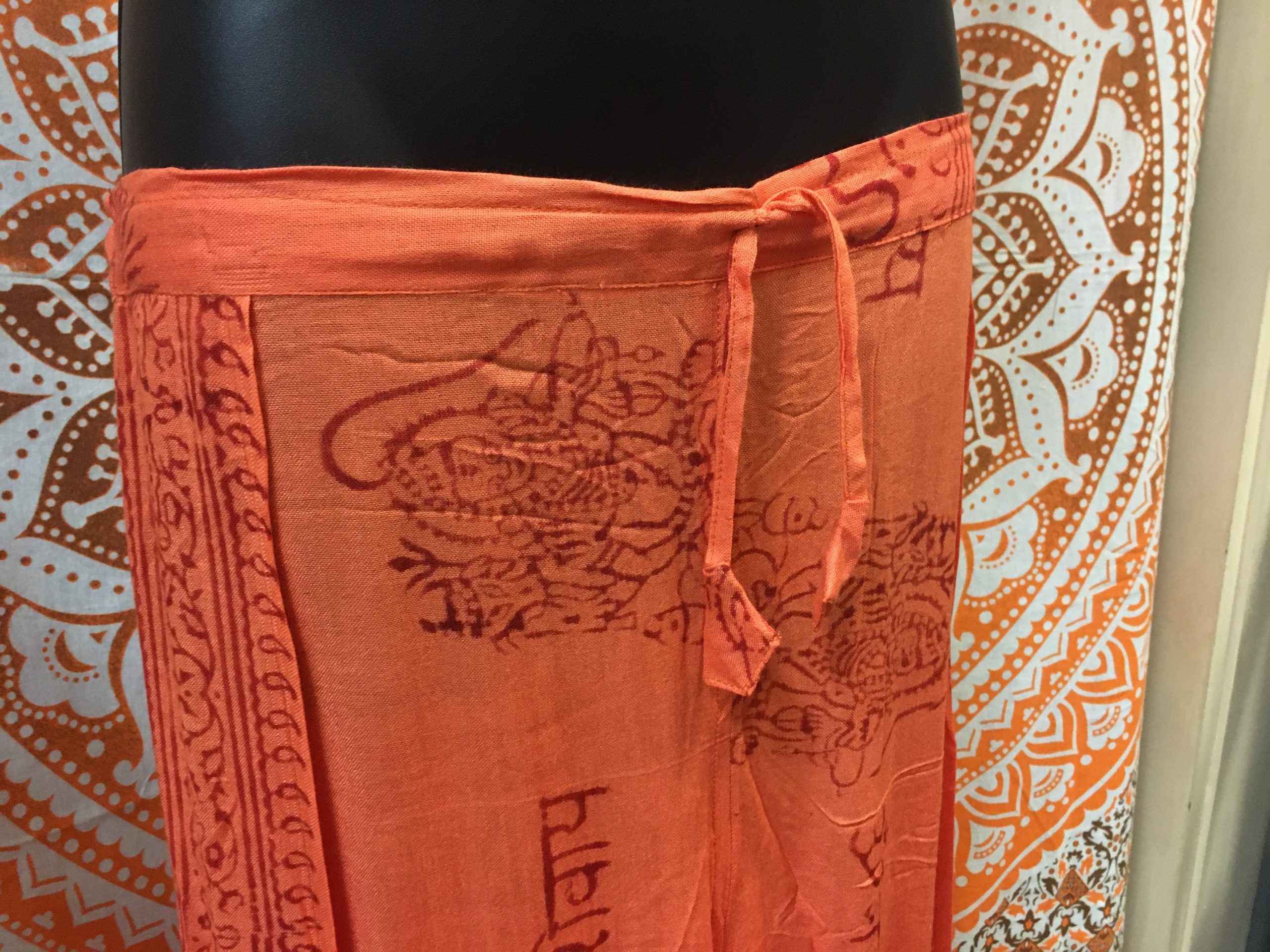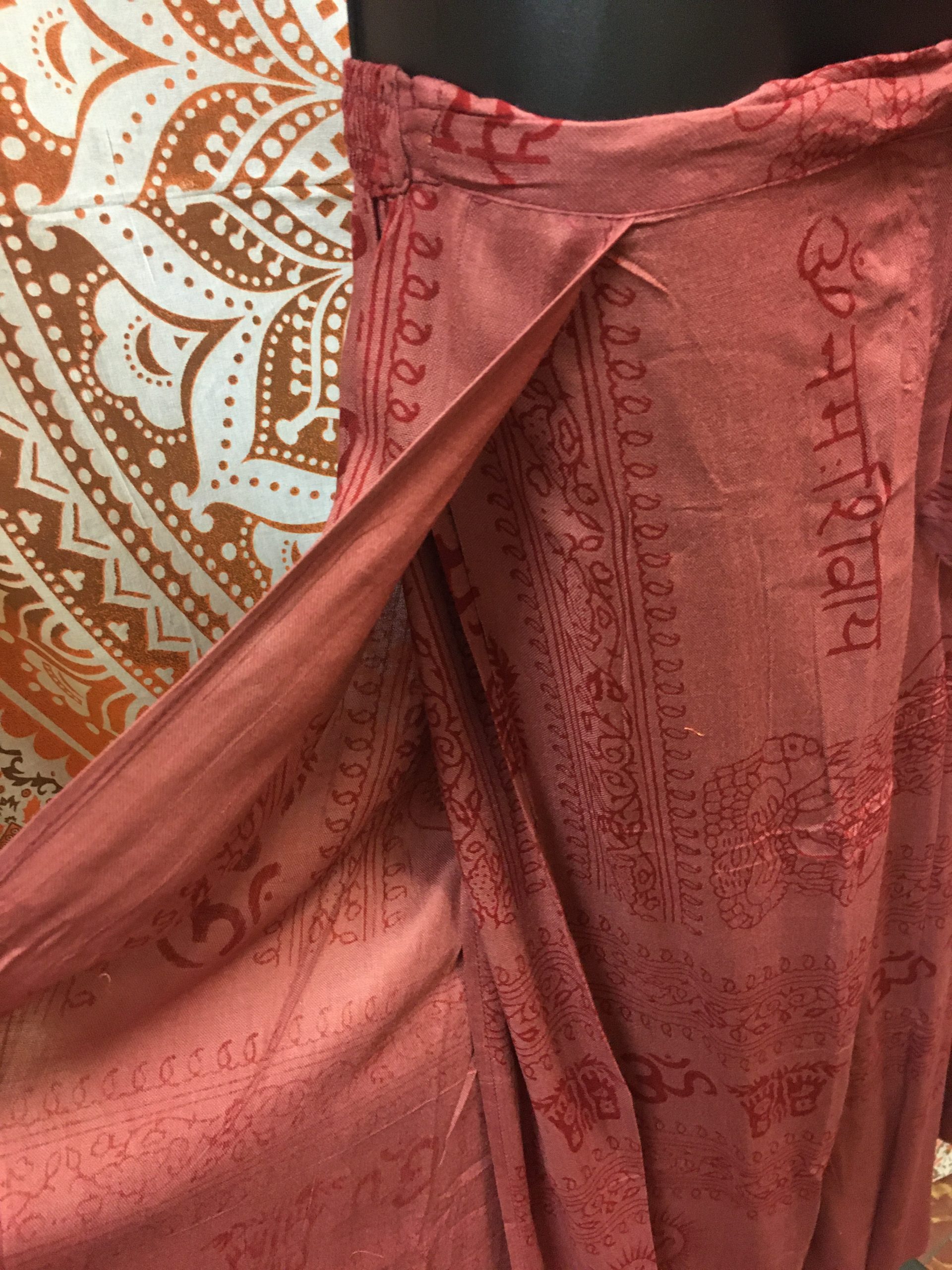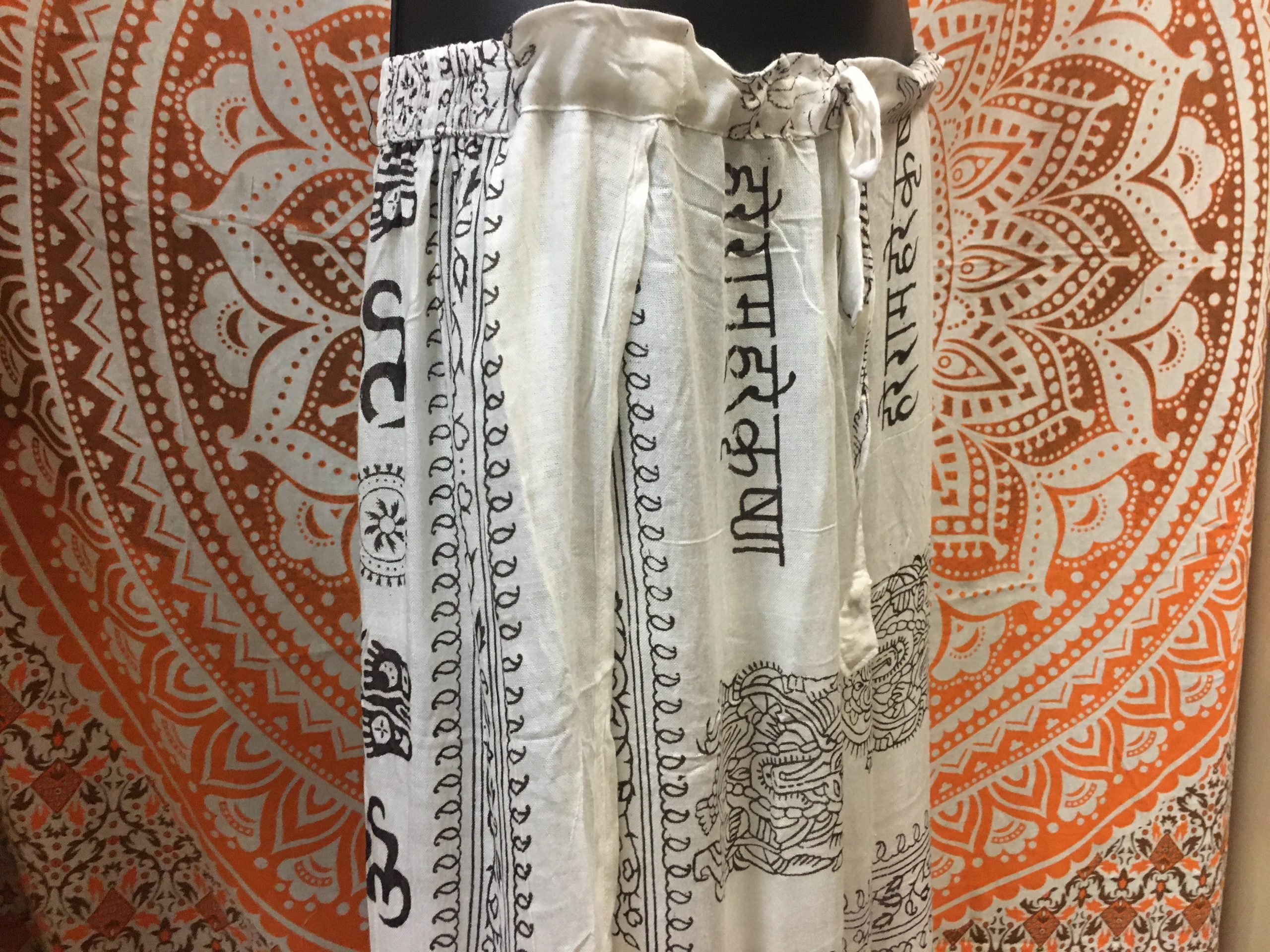 These lightweight pants are very comfortable and breezy. Only one size available, there is an adjustable elastic band and the pants are split on the size which made them very roomy.